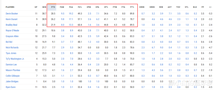 布克在这12场比赛中打了11场,场均38.7分钟拿到28.5分3.9篮板7.1助攻3.5失误;杜兰特打了9场比赛场均38.9分钟拿到26.2分4.6篮板4.6助攻2.3失误;比尔打了8场21.9分4篮板3.9助攻2.3失误。三巨头进攻没啥问题。