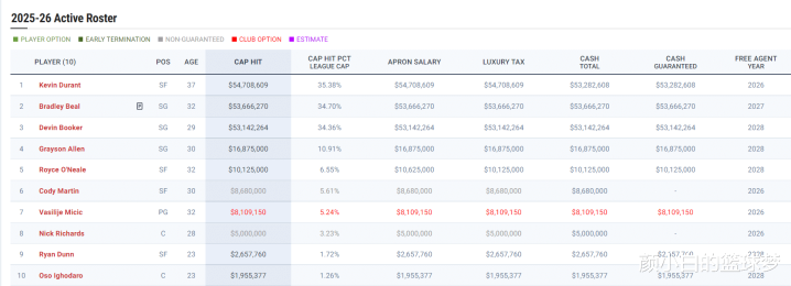25-26赛季,杜兰特5470万、比尔5364万、布克5314万,这三人就要拿走1.61亿,太阳如果本赛季附加赛都没有,今夏这三人不解体都不太可能。